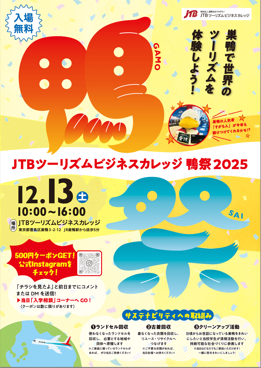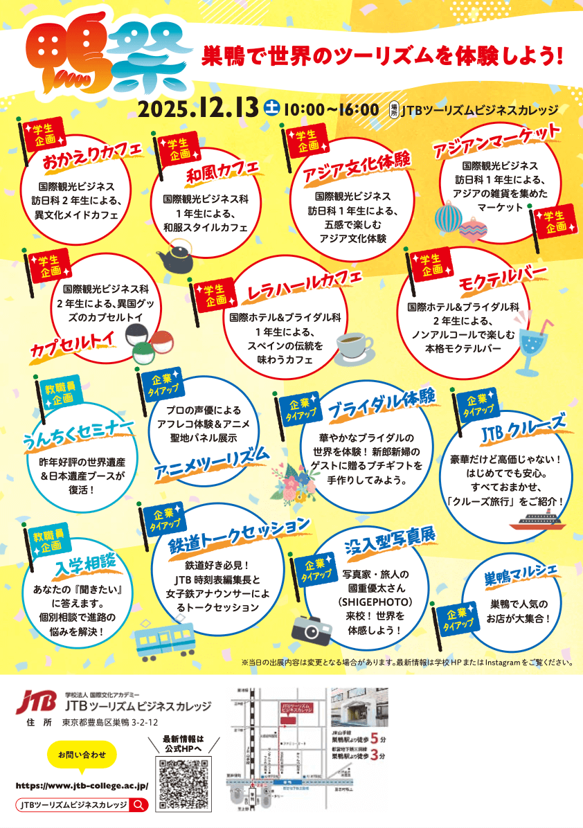 12月13日(土)JTBツーリズムビジネスカレッジの学園祭に参加します 投稿日 2025年12月4日 著者 jii カテゴリー News カテゴリー お知らせ 12月13日(土)10時から、巣鴨のJTBツーリズムビジネスカレッジにて開催する学園祭『鴨祭』 に参加します。 今回の学園祭のテーマは、「巣鴨で世界のツーリズムを体験しよう!」です。 学生たちが主体となって、表現力を発揮する場としてステージパフォーマンスや、様々なテーマにちなんだツーリズムブースが準備されています。国際色豊かな学生たちの熱意と笑顔あふれる学園祭をお楽しみいただけます。ぜひ私たちJIIのブースにも遊びに来てください。 イベント詳細はこちらから >> 🌟 2025年度 学園祭『鴨祭』開催のお知らせ 🌟 – 観光旅行ホテルブライダルの専門学校「JTBツーリズムビジネスカレッジ」2025年度の学園祭『鴨祭』を下記の通り 2日間 にわたり開催いたします。当校の学園祭は、学生たちが主体となっwww.jtb-college.ac.jp シェア ツイート コピー JII、OFP、おとなりさんボランティア、体験談